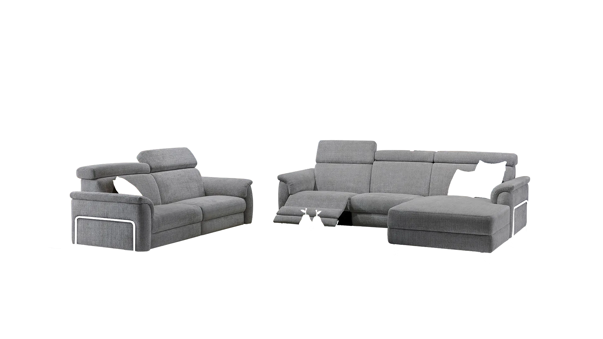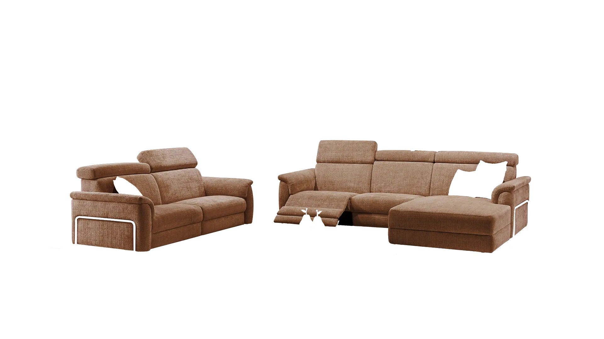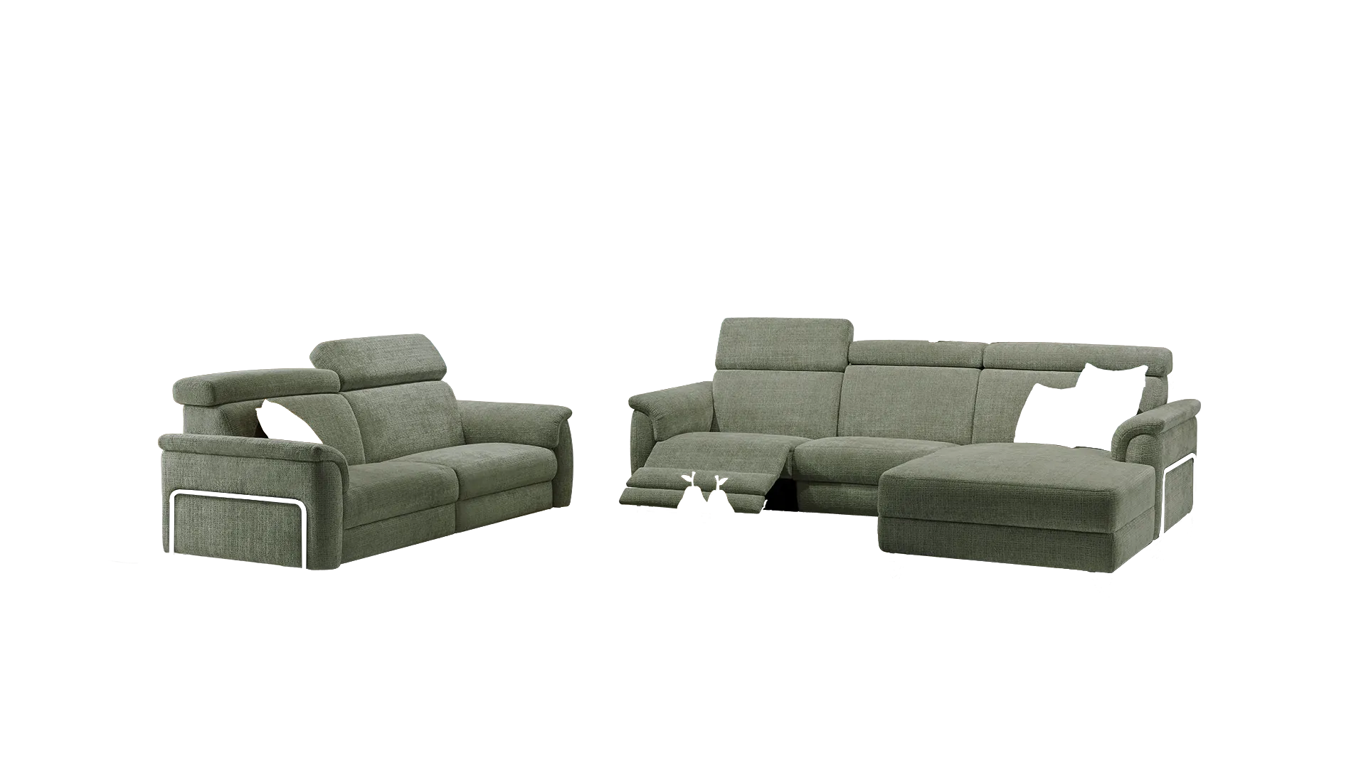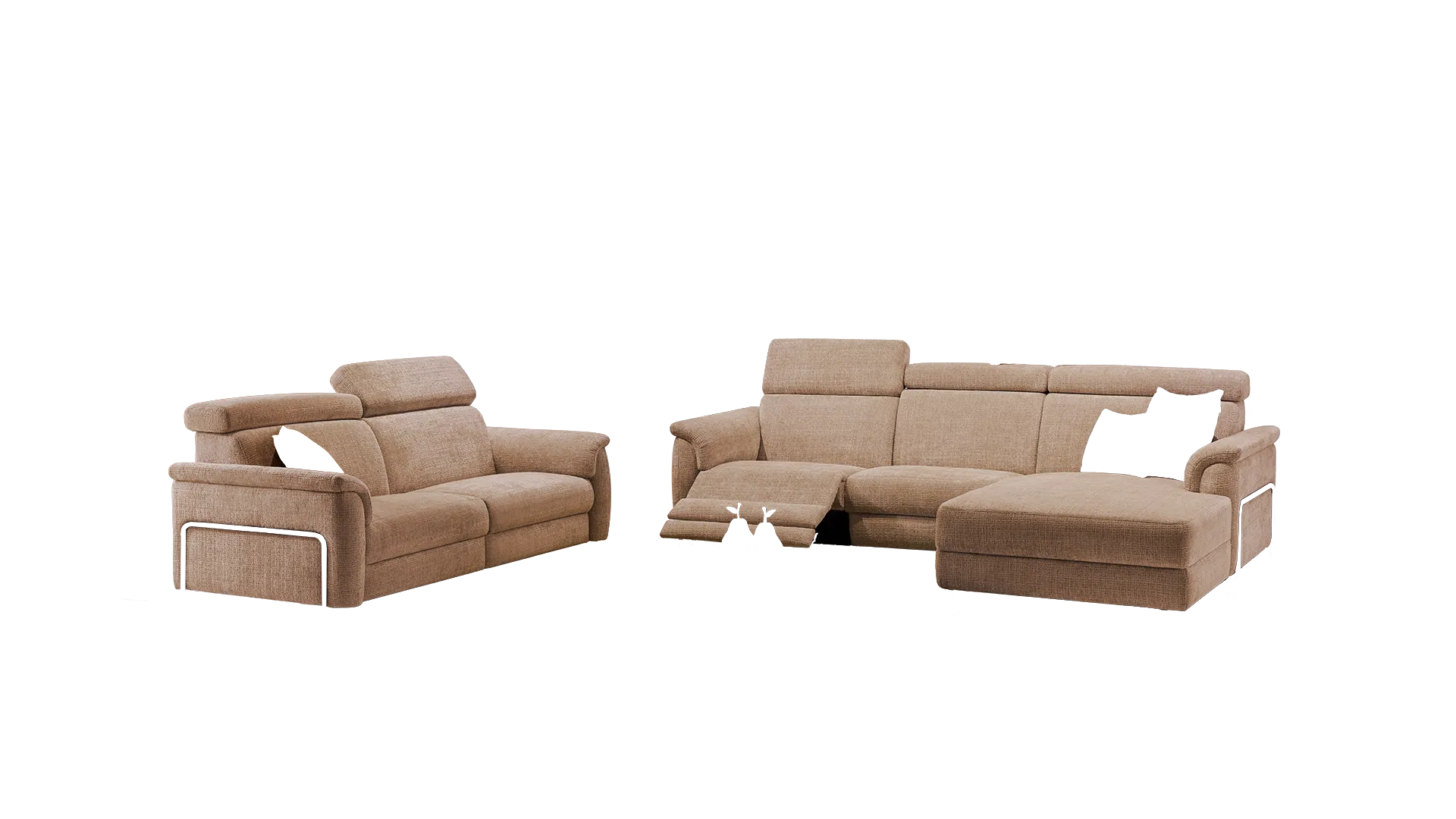 - Canapé 3 places, 2 relax électriques, 2 têtières manuelles relevables (L.202 x H.88 x P.95 cm).