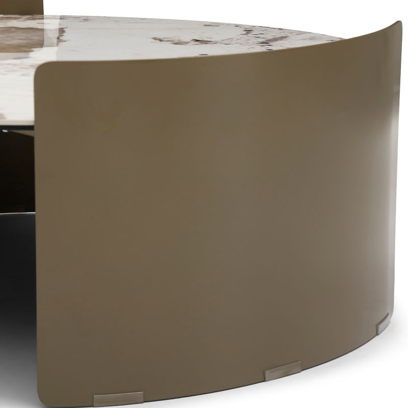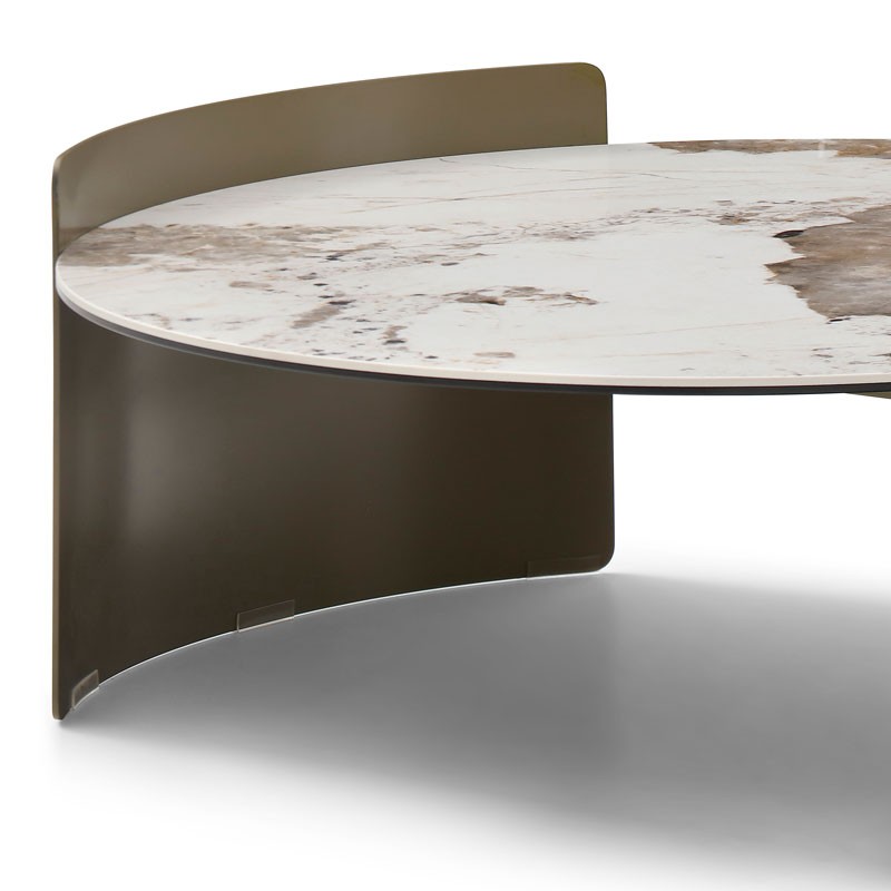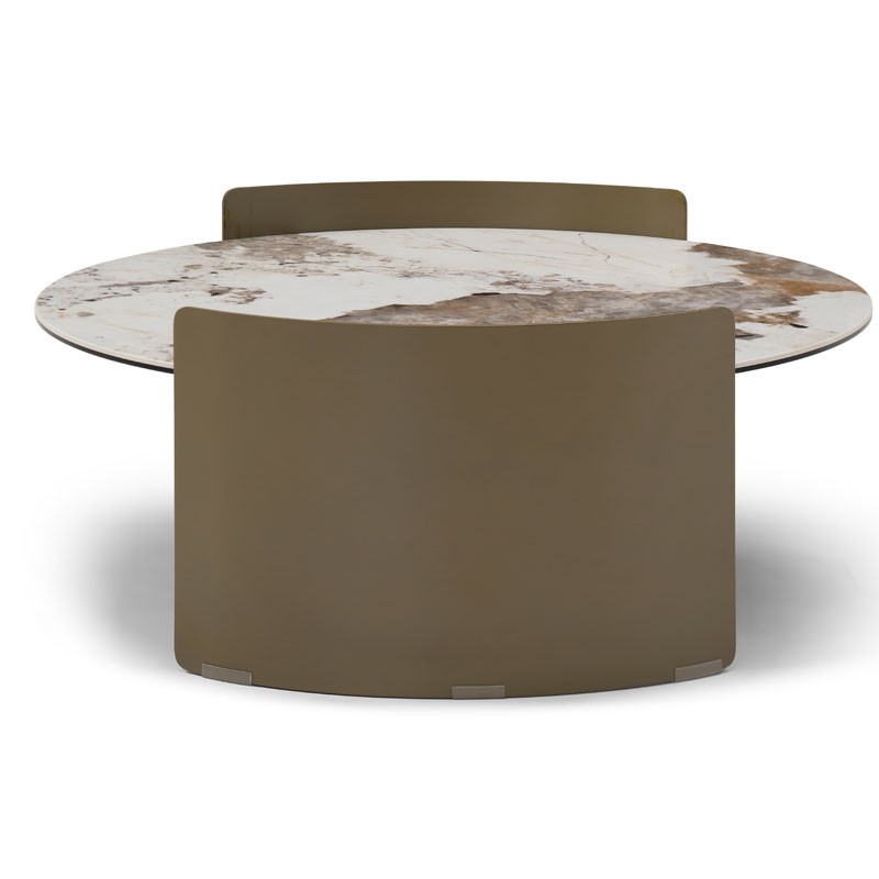 Faites entrer l'élégance et l'art dans votre salon avec la table basse AURORE ! Vous serrez séduit par ce design audacieux qui présente un plateau rond en céramique Pandora, enserré dans des panneaux incurvés couleur bronze. Châssis en métal laqué époxy bronze patiné, dessus en céramique Pandora 6mm sur verre épaisseur 6mm