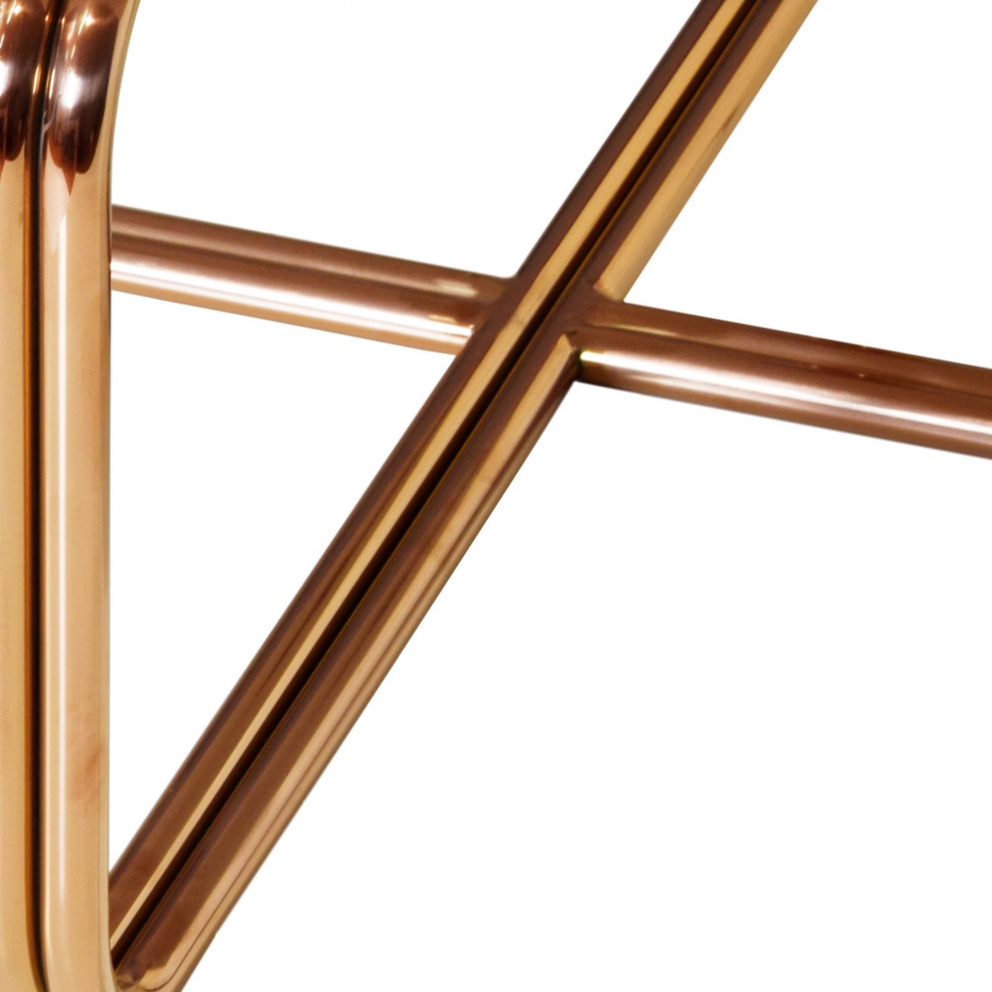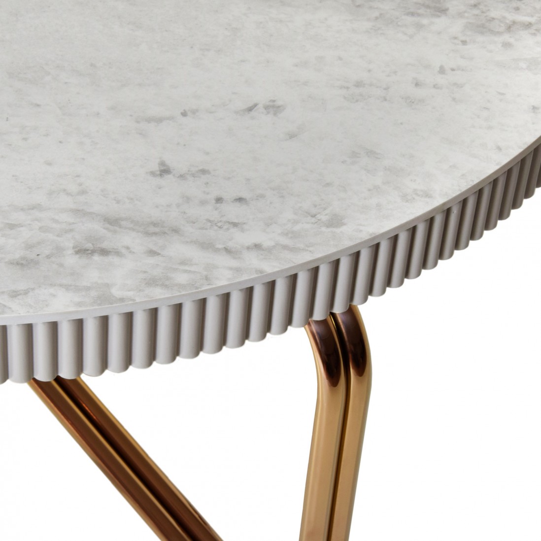 Structure de table en MDF avec plateau en pierre composite ; pieds en métal rose.