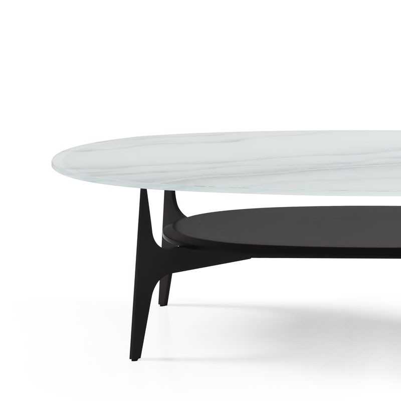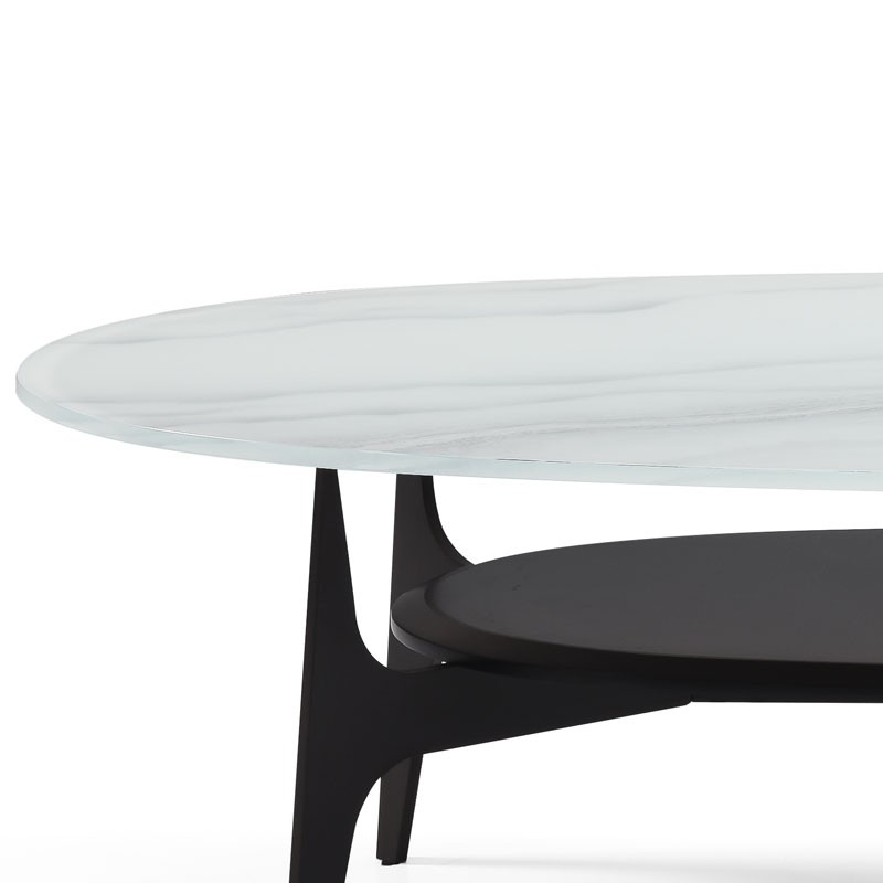Base en métal laqué gris anthracite, dessus en verre aspect jade blanc épaisseur 12mm, second plateau en MDF laqué noir. Gamme assortie, coin de canapé et table basse.